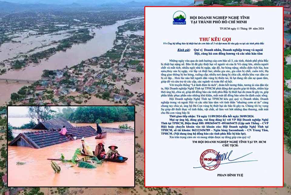 Hội Doanh nghiệp Nghệ Tĩnh tại TPHCM kêu gọi quý vị Doanh nhân, Doanh nghiệp trong và ngoài Hội và các nhà hảo tâm với tinh thần “nhường cơm sẻ áo” cùng chung tay chia sẻ, ủng hộ Bà Con vùng bị thiệt hại do bão lũ gây ra. Chúng tôi hy vọng Sự giúp đỡ thiết thực về tinh thần, vật chất, sẽ làm vơi bớt những đau thương, mất mát cho Bà con vùng bão lũ.