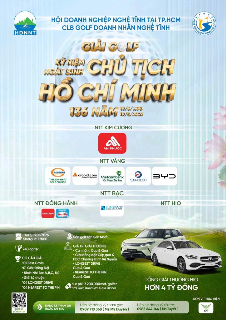 Nhân kỷ niệm 136 năm Ngày sinh của Hồ Chí Minh (19/5/1890 – 19/5/2026), Câu lạc bộ Golf Doanh nhân Nghệ Tĩnh (trực thuộc Hội Doanh nghiệp Nghệ Tĩnh tại TP.HCM) sẽ tổ chức Giải Golf kỷ niệm vào ngày 19/5/2026 tại Sân Golf Tân Sơn Nhất. Sự kiện không chỉ mang ý nghĩa tưởng nhớ vị lãnh tụ vĩ đại của dân tộc mà còn là dịp để cộng đồng doanh nhân tăng cường giao lưu, kết nối và thúc đẩy hợp tác phát triển.